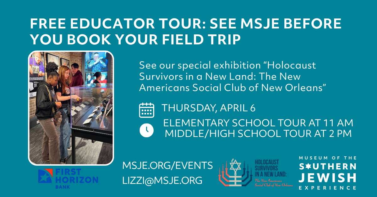 The Museum of the Southern Jewish Experience explores the many ways that Jews in the American South influenced and were influenced by the distinct cultural heritage of their new homes. Through exhibits, collections and programs focused on the unique and remarkable history of Southern Jews, the Museum encourages new understanding and appreciation for identity, diversity, and acceptance. MSJE offers field trips, lesson plans and programming to students and families throughout the year.