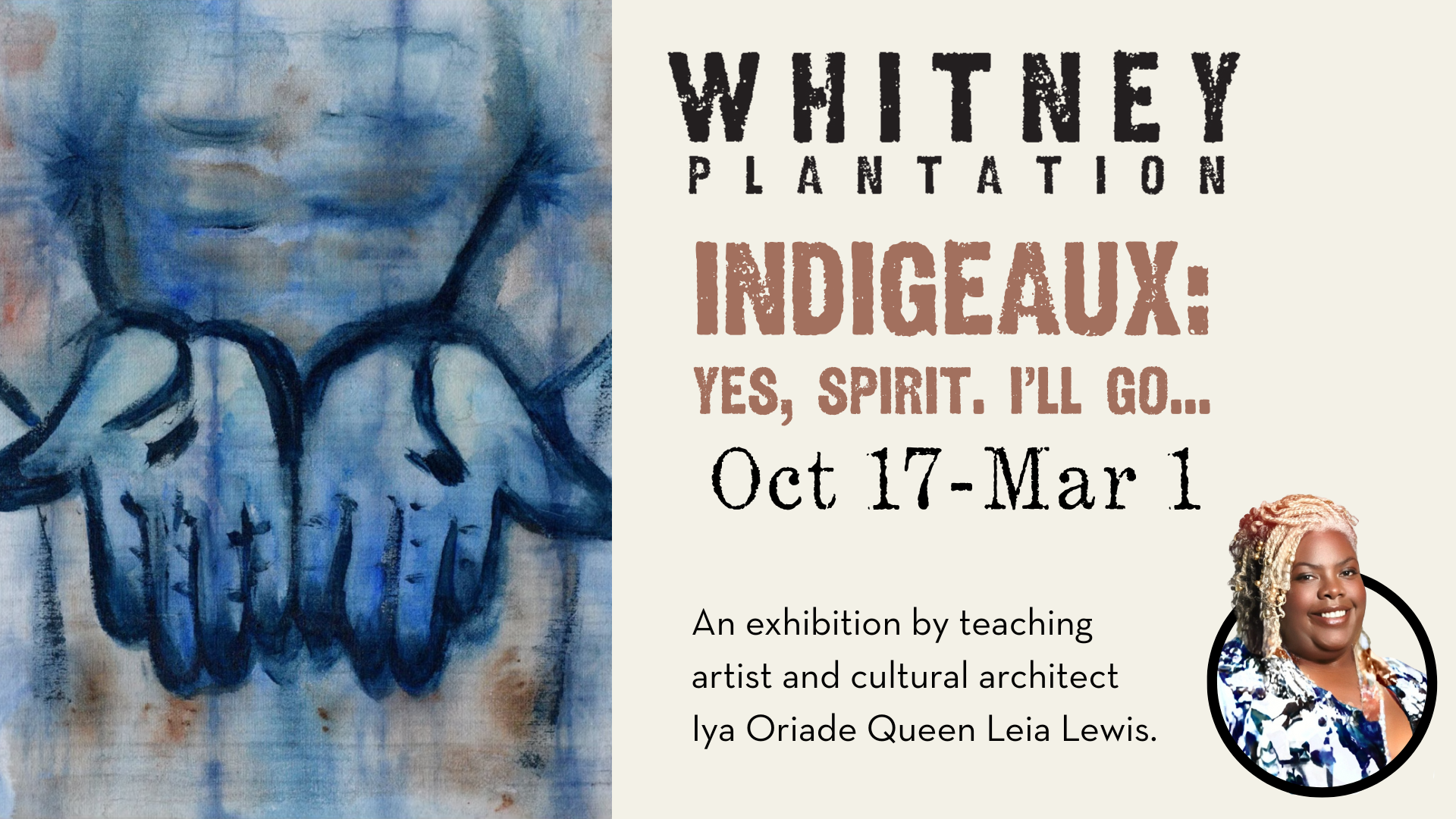 Join Whitney Plantation for Indigeaux: Yes, Spirit. I’ll go…, an exhibition by teaching artist and cultural architect Iya Oriade Queen Leia Lewis, opening October 17, 2025 and on display through March 1, 2025. Access to the exhibit is FREE!